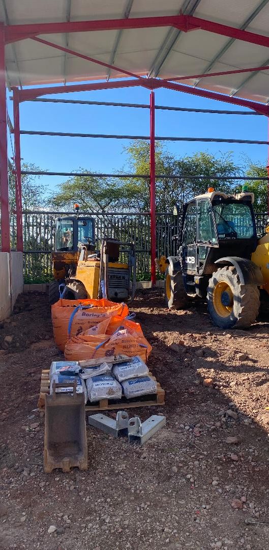The workshop construction includes grouting of the steel base to ensure structural stability, alongside the digging of foundations and installation of a Type 1 sub-base with a heavy-duty reinforced concrete floor designed to accommodate the loads